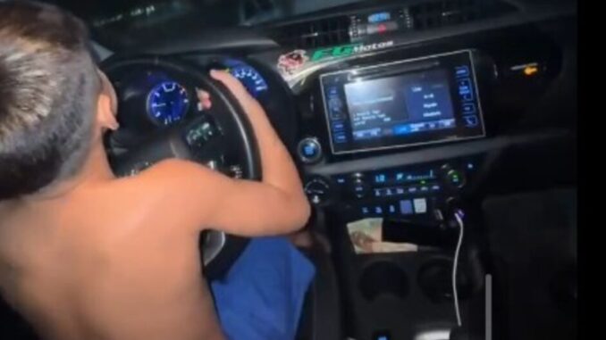 El video muestra al menor al volante, sin cinturón de seguridad ni remera y con la cara casi pegada al volante. Se lo ve concentrado mirando la calle mientras conduce con con la música bastante alta. Y mientras el vehículo avanza por la calle, se escucha al padre: “Pegale una pisadita”.