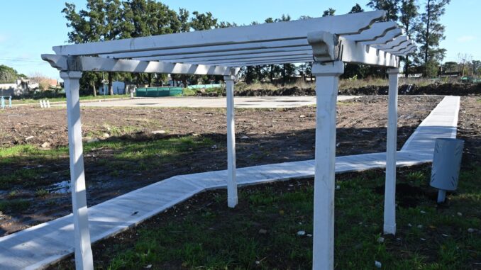 En una primera etapa, el circuito perimetral de veredas de hormigón armado contempla aproximadamente 200 metros lineales con un ancho de 1,20 m. La obra, puesta en marcha con fondos municipales, está acompañada por pérgolas premoldeadas donde en los próximos días se colocarán bancos y mesas.