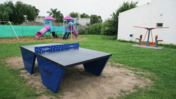 Posteriormente, se colocó el mobiliario urbano que incluye dos pérgolas, cestos de basura y juegos infantiles: un sube y baja, un mangrullo y un pórtico con hamacas, una mesa de ping pong. Además, se instalaron nuevas luminarias.