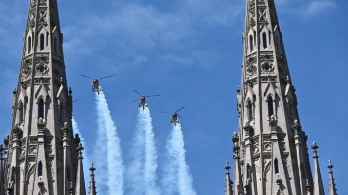 Con la presencia del intendente Leonardo Boto, autoridades del Complejo Museográfico Provincial E. Udaondo, y vecinos y visitantes que se acercaron hasta la Basílica de Luján, la ciudad vivió un momento único con el espectacular sobrevuelo sobre la Plaza Belgrano y el casco histórico de la Patrulla ASPA. Participaron seis helicópteros Eurocopter EC-120 Colibrí, que realizaron maniobras de alta precisión y desplegaron humo con los colores de la bandera argentina, en una demostración aérea de gran destreza.