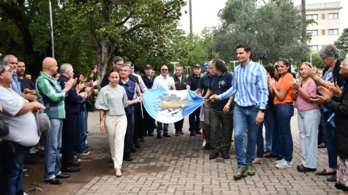 Durante el acto, se realizó el izamiento de las banderas nacional, bonaerense y distrital, acompañado por la interpretación de la canción Aurora. Asimismo, y en cumplimiento de la ordenanza N° 5383/25, se llevó a cabo el izamiento de la Bandera de las Islas Malvinas en el mástil histórico de la plaza, la cual fue bendecida por el padre Javier, de la Parroquia Nuestra Señora del Carmen.