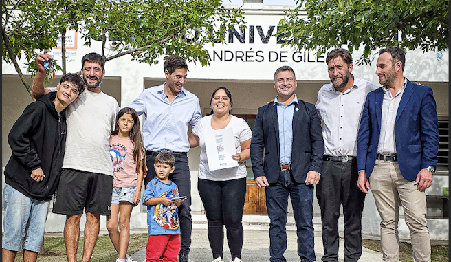 La jornada comenzó en el barrio Scully (Alsina y Calle 61), donde se realizó la entrega simbólica de la primera unidad a Karina Paola Mendoza y Julio Cesar Romano quienes recibieron las llaves de su nuevo hogar, marcando el inicio de una nueva etapa para ocho familias gilenses.